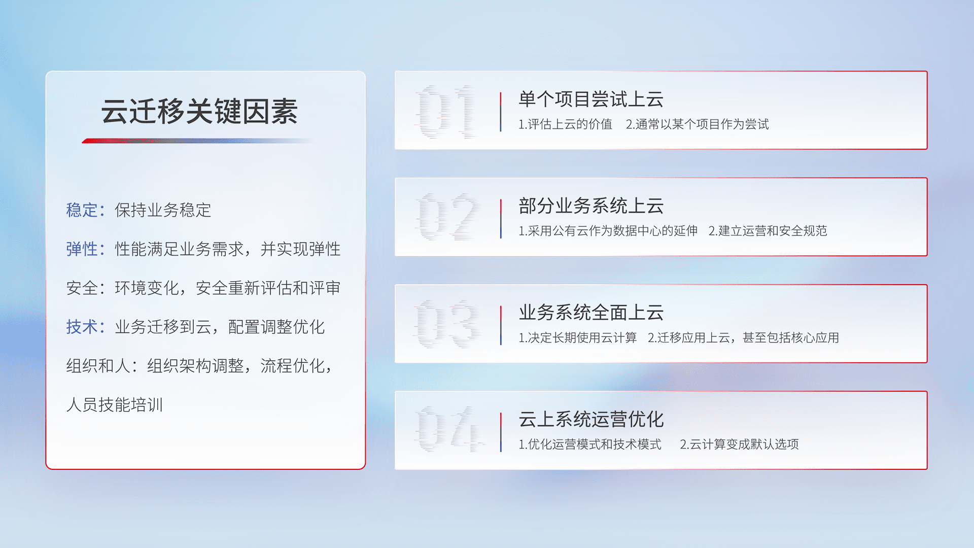 结合实际业务,,,从规划设计、、云平台选型、、、云原生改造、、、、数据迁移、、集成交付,,迁移全过程为客户识别最佳上云路径,,做好风险识别管理,,,,设计网络架构、、、身份权限、、、、安全审计合规、、、操作审计、、日志审计、、、、监控告警策略、、、、多站点容灾设计等,,对云上基础设施进行整体规划,,,提升IT治理水平,,,,以满足弹性、、、、高可用、、、高性能的需求。。。。