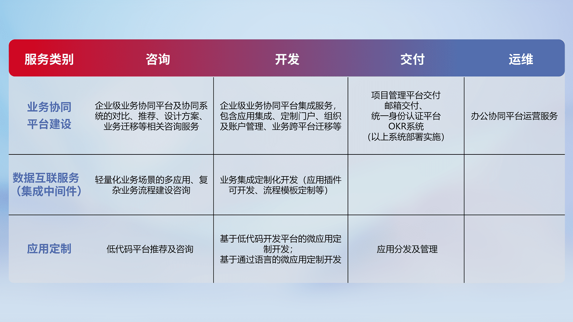 针对钉钉、、、企微、、、、IDaas等平台级产品提供产品的规划、、方案、、、交付、、定制化开发等服务,,实现如统一协同办公、、、、智能客户服务、、混合会议管理、、、智能数据查询、、、、等业务场景,,,实现数字化转型。。。。